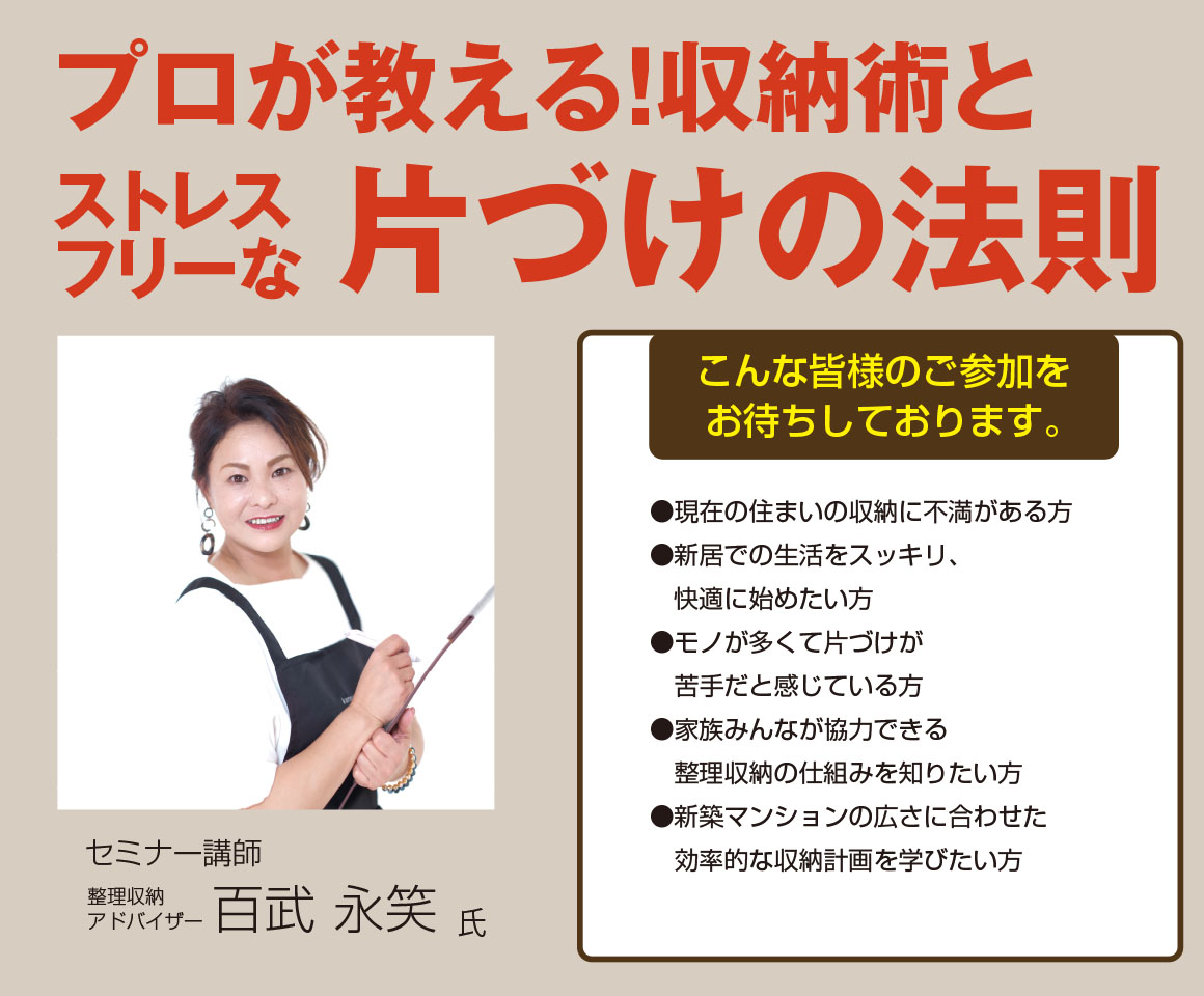 快適な新生活の実現に欠かせないのが「収納」です。限られた空間を最大限に活かし、美しく、使いやすい部屋を維持するには、特別なノウハウが必要です。本セミナーでは、整理収納アドバイザーが、失敗しない収納計画の立て方、散らからない仕組みづくり、そして家族構成や生活スタイルに合わせた具体的な収納テクニックを、事例を交えてわかりやすくご紹介します。理想の暮らしを叶える整理収納の考え方を手に入れましょう。