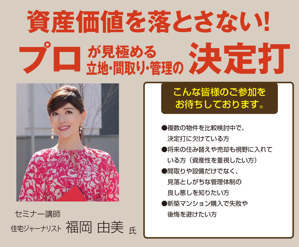 マ一生に一度の大きな買い物であるマンション購入。夢や希望だけでなく、「資産価値」という視点も非常に重要です。本セミナーでは、「買ってよかったと将来後悔しない物件」の見分け方を徹底解説します。浜松市のマンション市況や立地の優位性、将来にわたる資産性を左右する「管理の質」のチェックポイントなど、プロの視点を学び、後悔のない購入を成功させるためのポイントをご紹介します。
